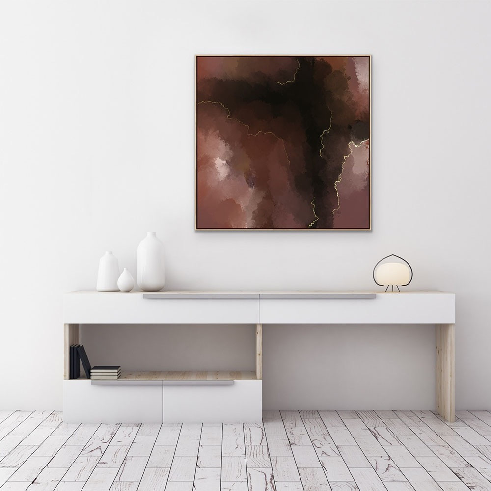 نوع اللوحة: لوحة تجريدية مربعة الشكل، موضوعة في وسط جدار أبيض. تتميز اللوحة بتداخل معقد بين درجات البني الداكن والفاتح، تتراوح بين البني الغامق والغني والبني الوردي الباهت ولمحات من البيج.