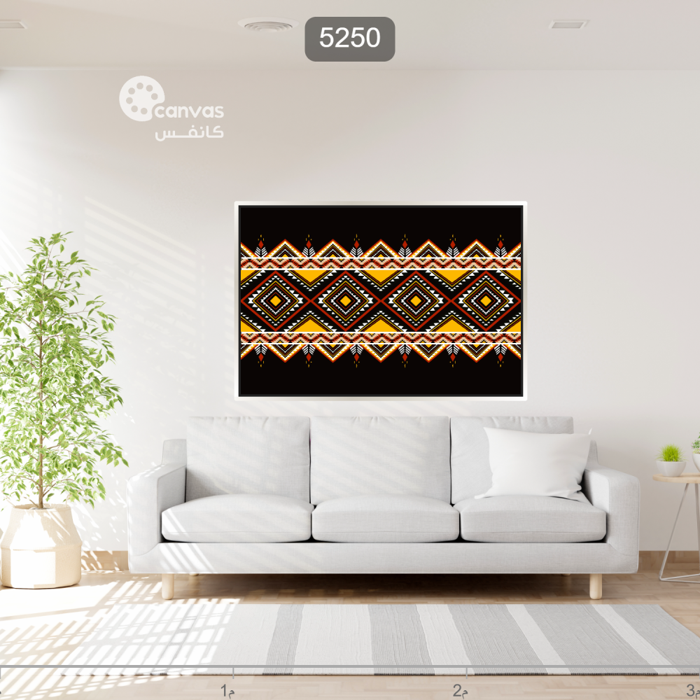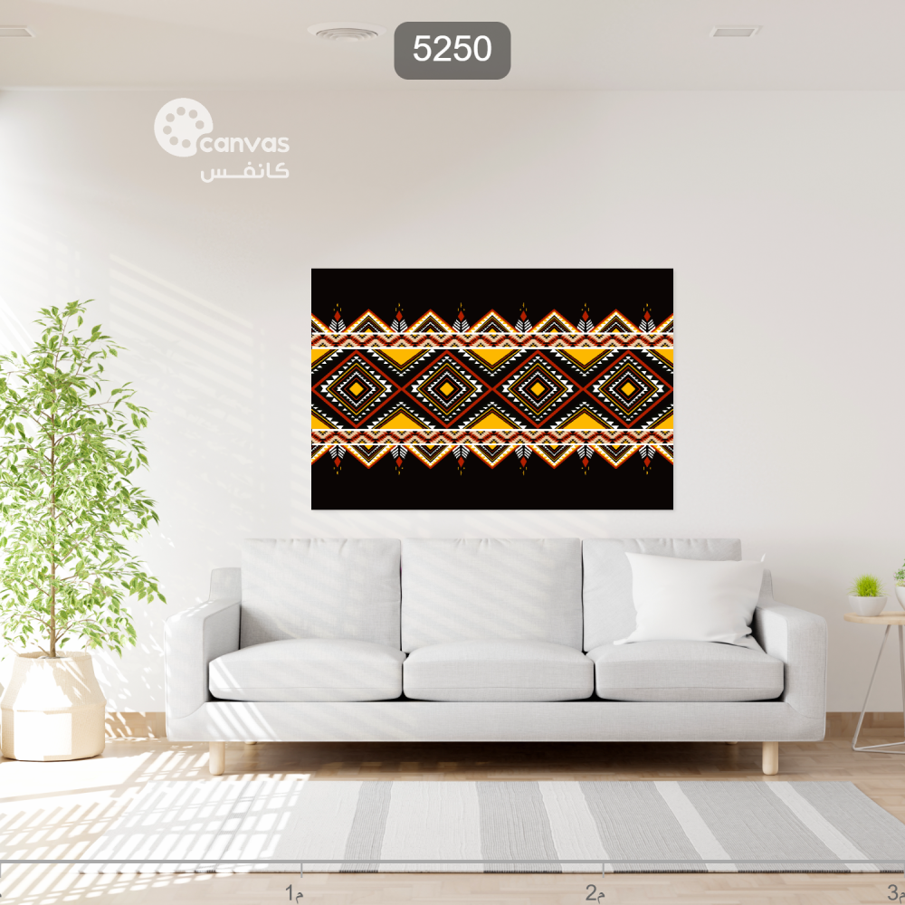 نوع اللوحة: عمل فني بنمط هندسي ماسي وشيفرون بألوان (أصفر، برتقالي، أحمر، أسود). إطار ذهبي.