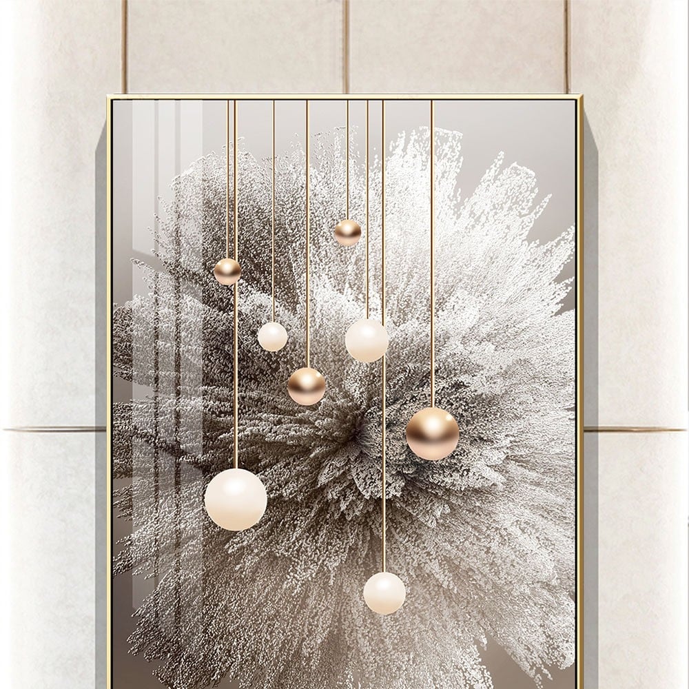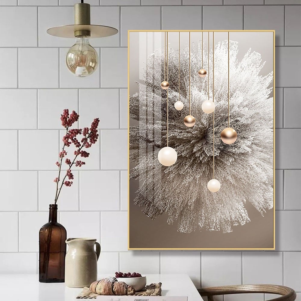 نوع اللوحة: لوحة بتصميم زهري بلون البيج والبني الرمادي، مع كرات ذهبية متدلية من خيوط. الخلفية محايدة، والإطار ذهبي.
