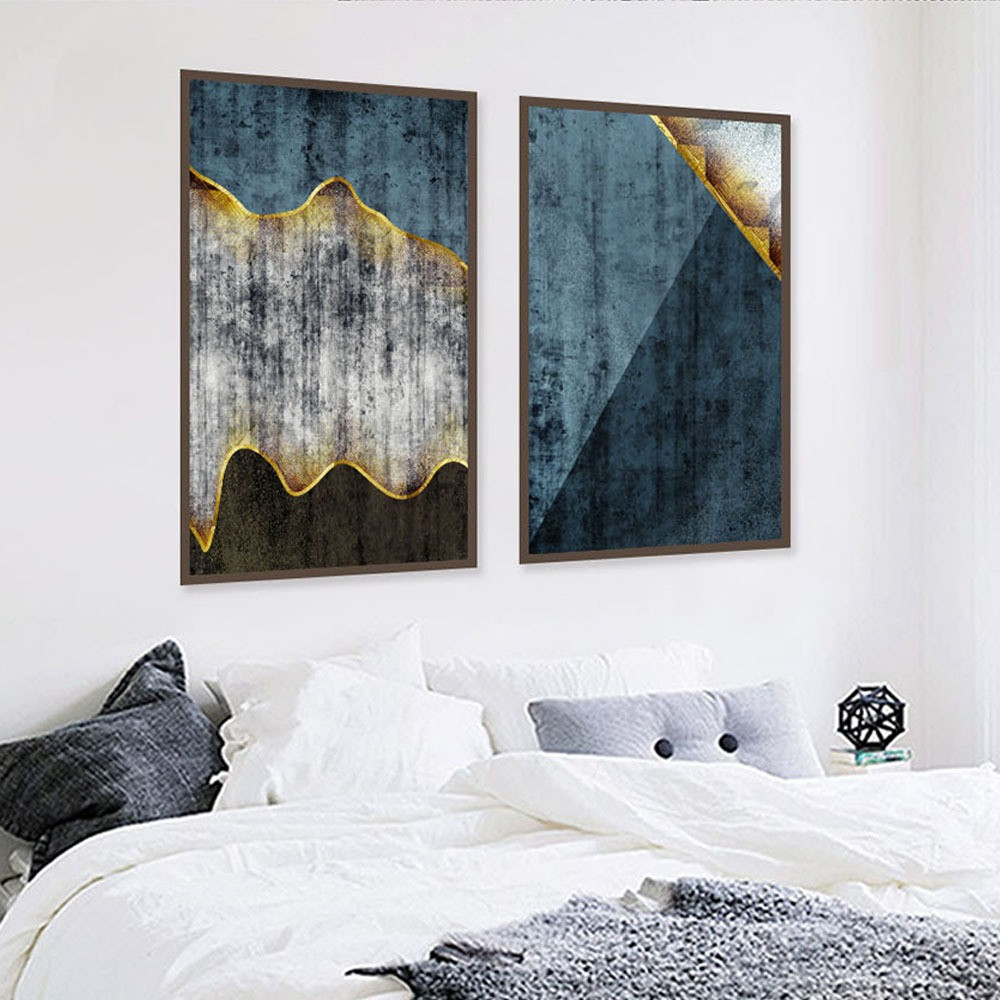 نوع اللوحة: قطعتان فنيتان تجريديتان بتأثير أسطح قديمة متآكلة. ألوان أزرق، رمادي، أبيض، ولمسات ذهبية.