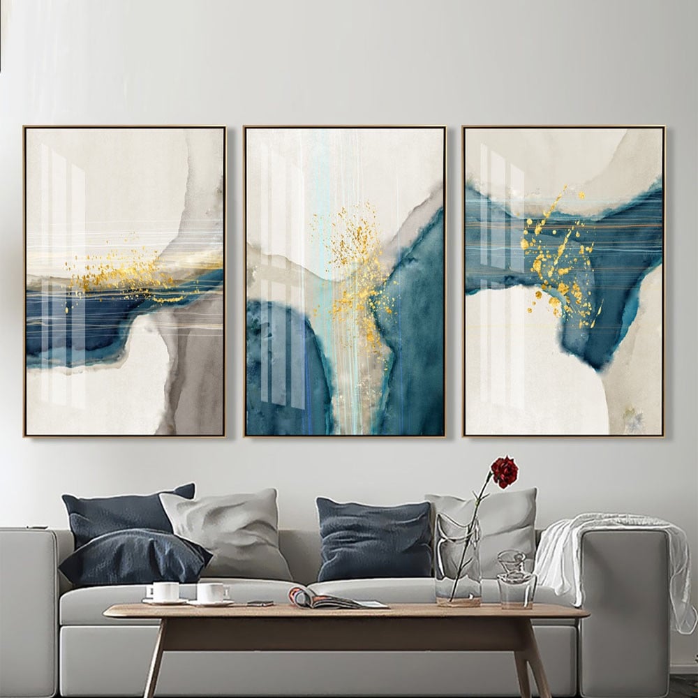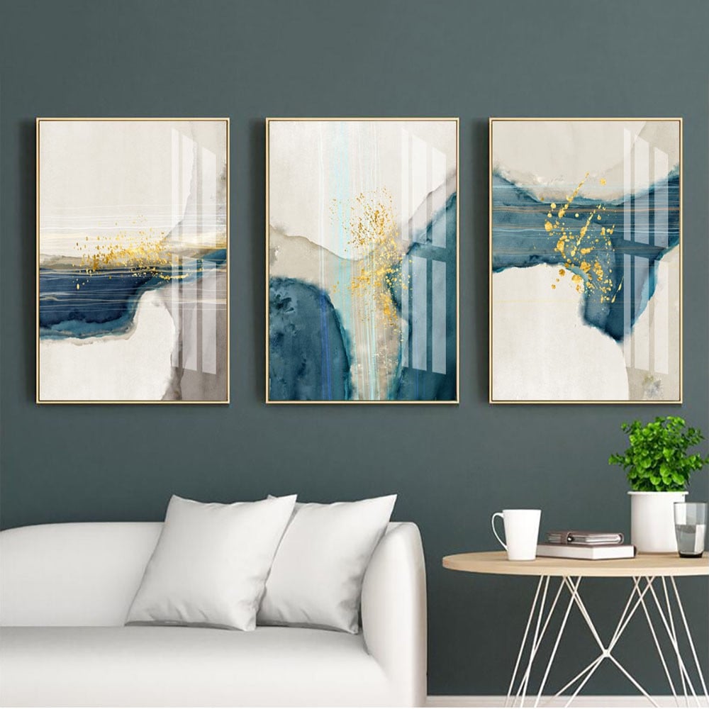 نوع اللوحة: قطعتان فنيتان تجريديتان بدرجات أزرق باهت، عاجي، رمادي، وبقع ذهبية. أسلوب انسيابي.