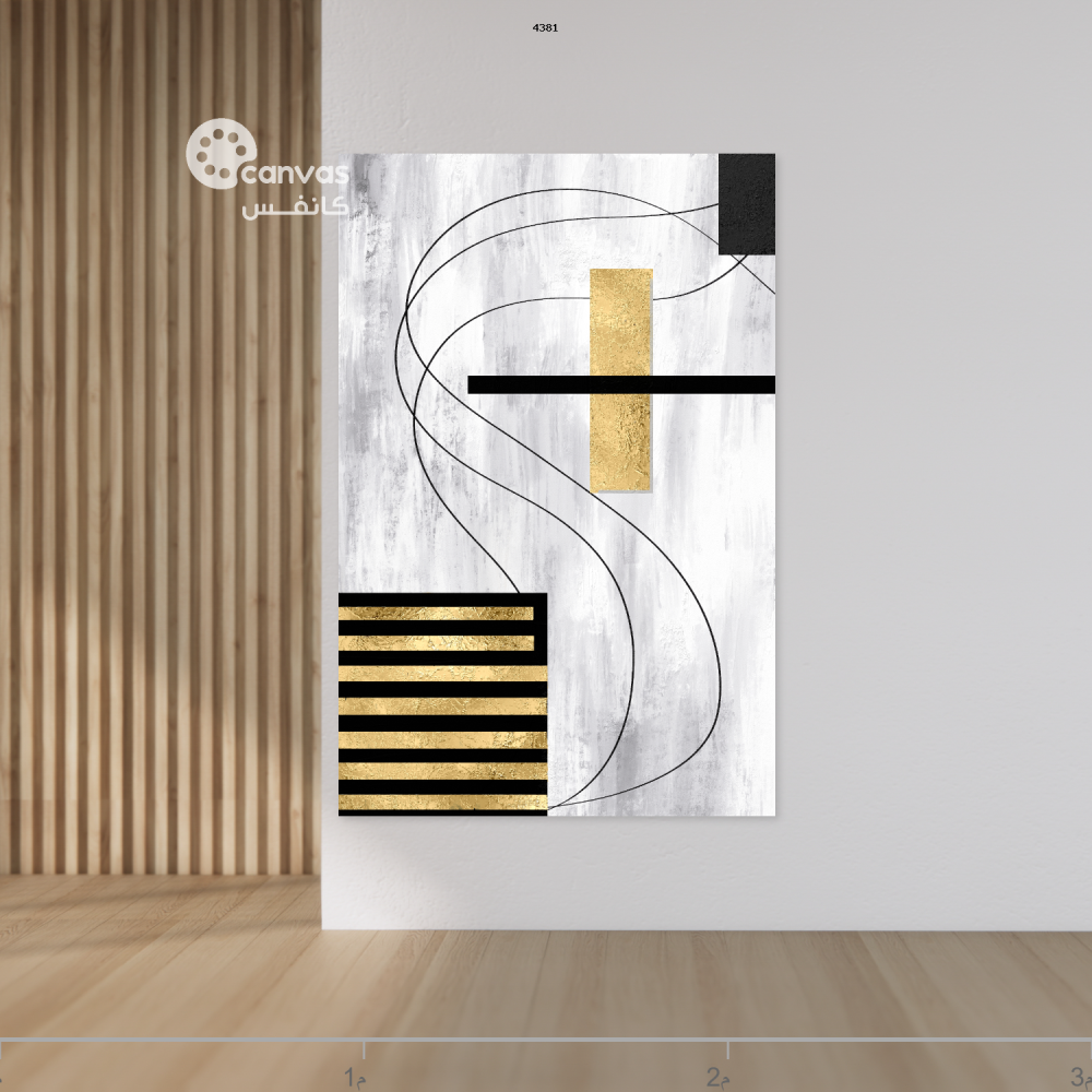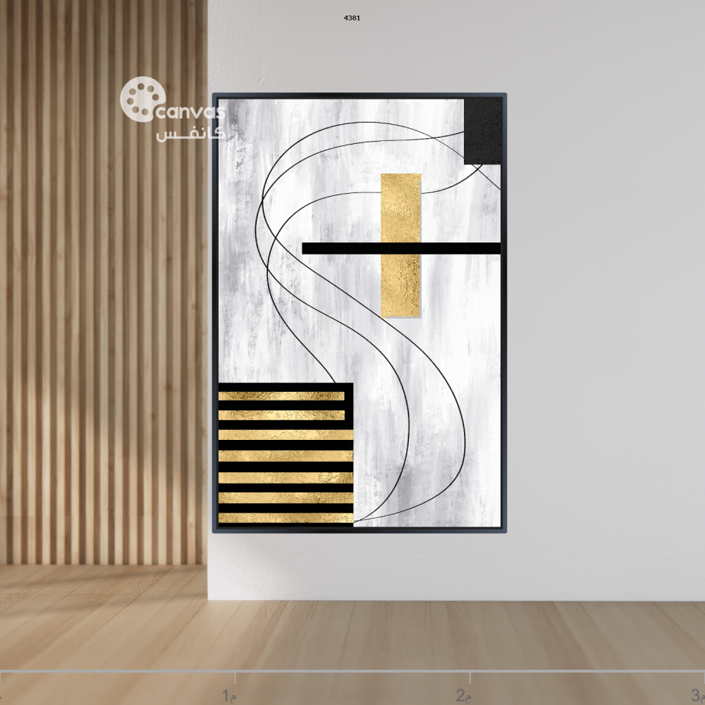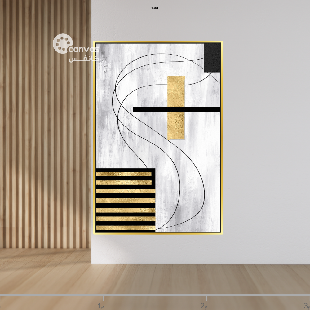 نوع اللوحة: لوحة تجريدية بأشكال رمادية بيضاء وخطوط سوداء انسيابية، مع لمسات بارزة من ورق الذهب. التركيبة متوازنة بين الأشكال المستقيمة والمنحنية، والإطار ذهبي.