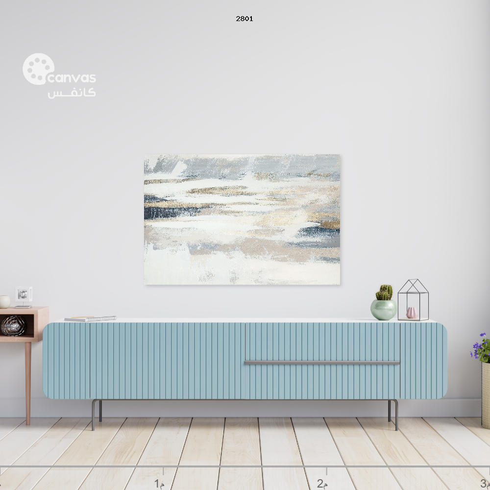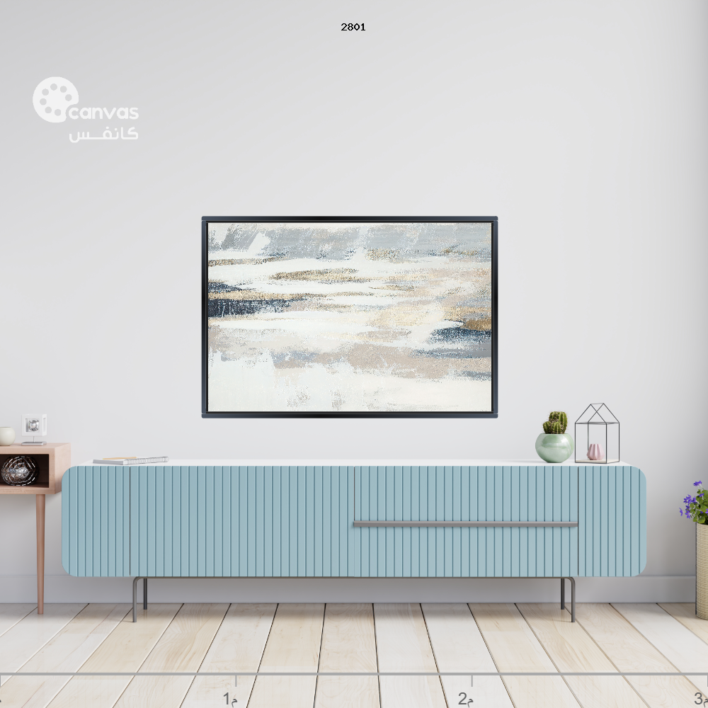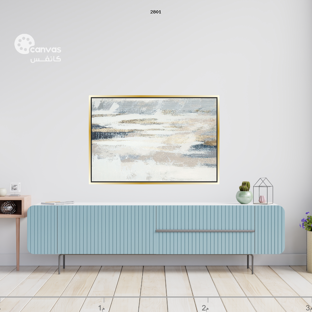نوع اللوحة: لوحة تجريدية أفقية مستطيلة الشكل، مؤطرة بالذهب. تُصوّر تجريدًا بأسلوب المناظر الطبيعية، بخطوط أفقية من درجات الرمادي والبيج والأبيض الباهتة. ضربات الفرشاة متعددة الطبقات تخلق إحساسًا بالحركة والعمق.