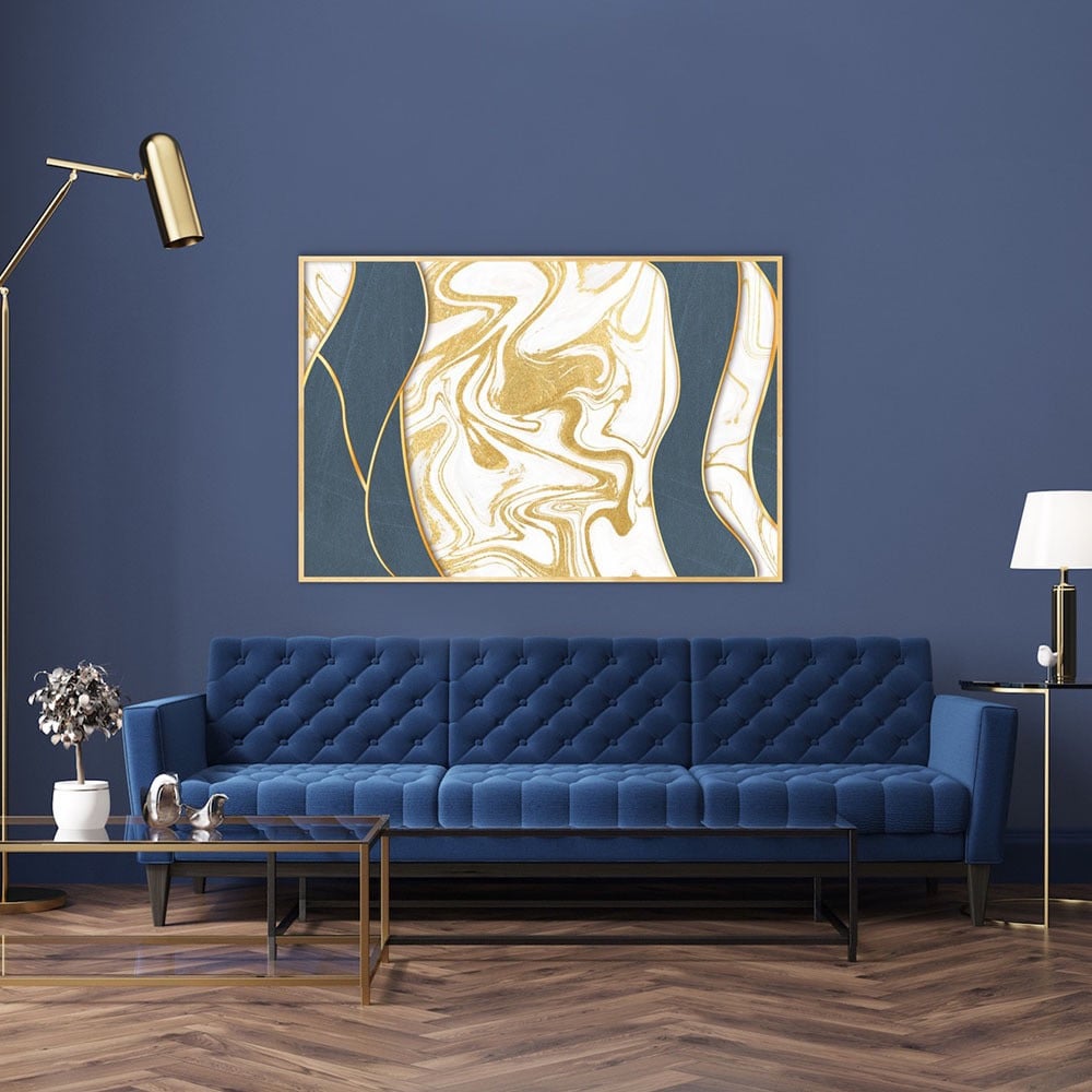 نوع اللوحة: لوحة تجريدية رمادية داكنة وكحلية، مع نقش رخامي ذهبي/برونزي.