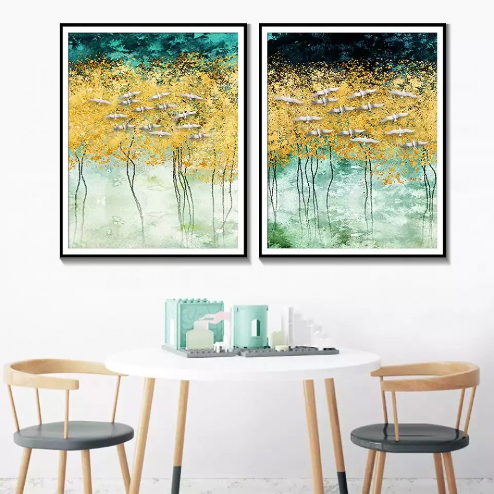 نوع اللوحة: لوحتان تجريديتان لمشهد غابي مع طيور رمادية/بيضاء. أشجار خضراء/رمادية داكنة، بلمسات ذهبية.