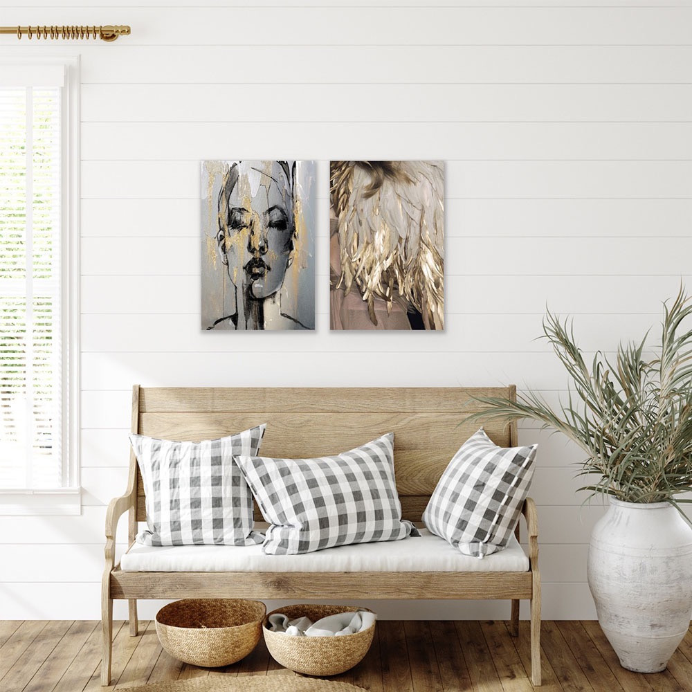 نوع اللوحة: لوحتان: وجه أنثوي رمادي ووجه ذهبي تجريدي.