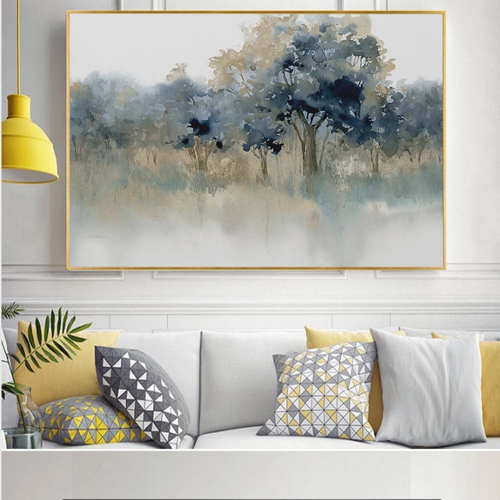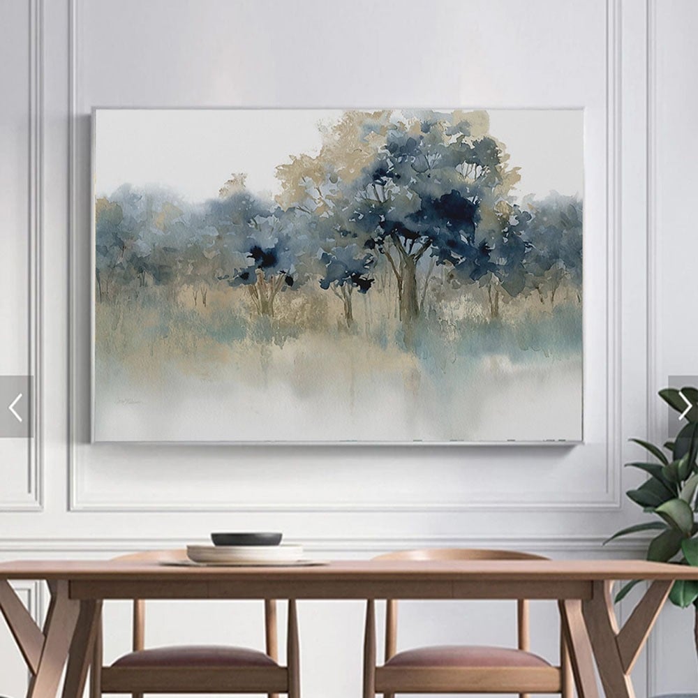 نوع اللوحة: لوحة لمنظر طبيعي بصف أشجار بدرجات أزرق رمادي، بيج غامق، وذهبي فاتح. أسلوب ألوان مائية.