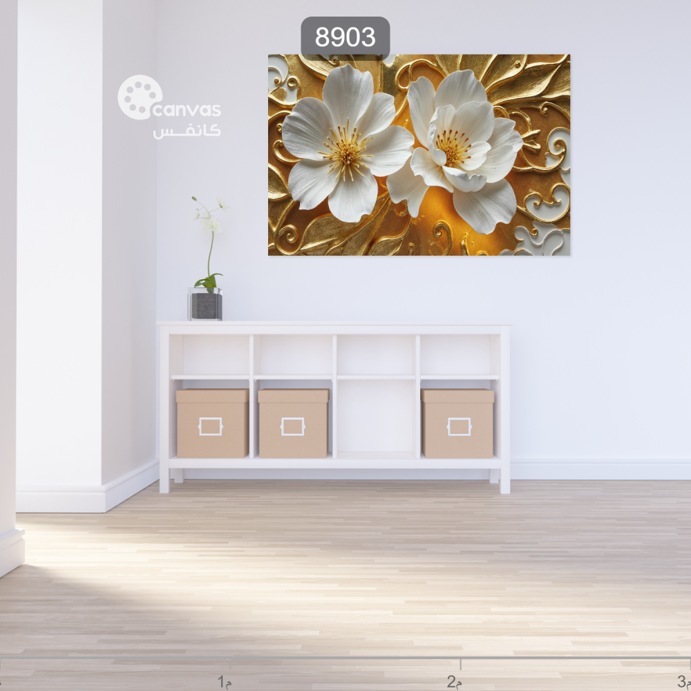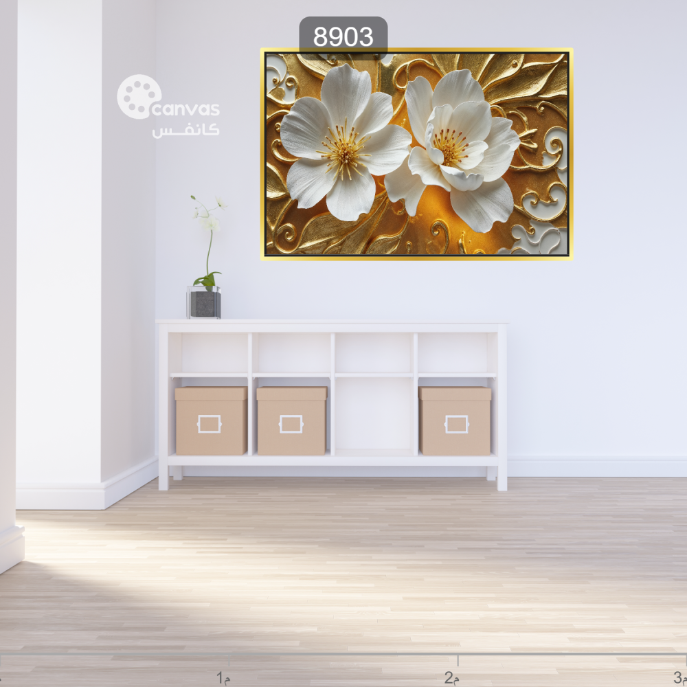 نوع اللوحة: عمل فني مُؤطَّر ومُزخرف يُصوِّر زهرتين كبيرتين بيضاوين. تتميز الأزهار بتفاصيلها الدقيقة، وتأثيرها ثلاثي الأبعاد، وملمسها المُحاكي، الذي يُشبه الخزف المنحوت. تُزيِّن لمسات وتفاصيل ذهبية اللون تصميم الخلفية المحيطة بالأزهار.