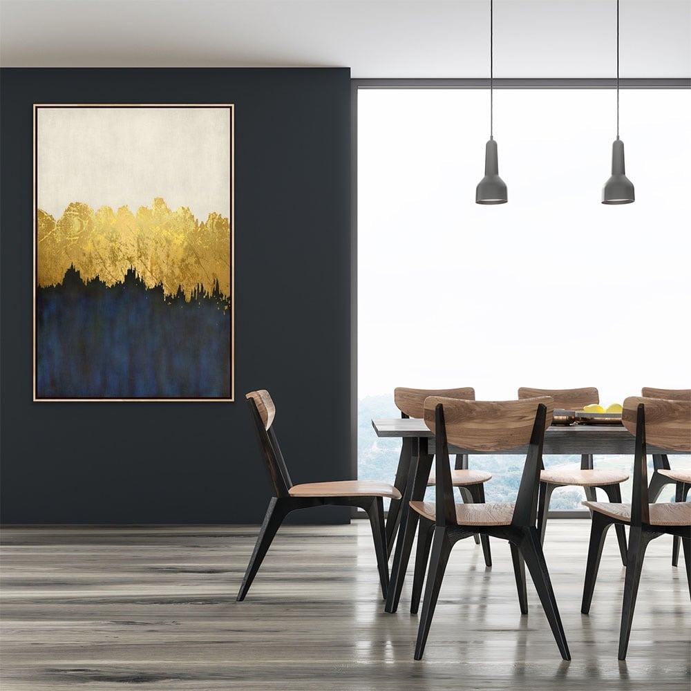 نوع اللوحة: لوحة تجريدية كبيرة، موضوعة في وسط جدار بيج فاتح، تتميز بتدرج أفقي للألوان. الجزء العلوي ذهبي باهت، يُشبه سلسلة جبال، بينما يتحول الجزء السفلي إلى أزرق بحري غامق وغني. يتميز اللون الذهبي بمظهر محكم يشبه أوراق الشجر. حواف الجزء الذهبي ضبابية وناعمة ومتعددة الطبقات لإضفاء إحساس بالعمق.