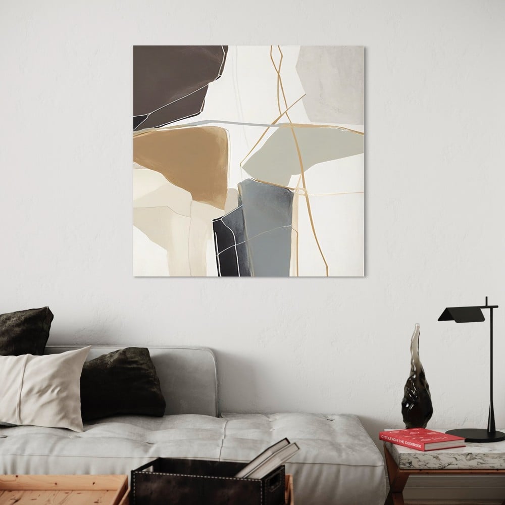 نوع اللوحة: لوحة تجريدية مؤطرة تتألف من أشكال متنوعة بدرجات البيج والبني والرمادي والأسود. تتداخل الأشكال وتتشابك، مما يخلق تركيبة ديناميكية.