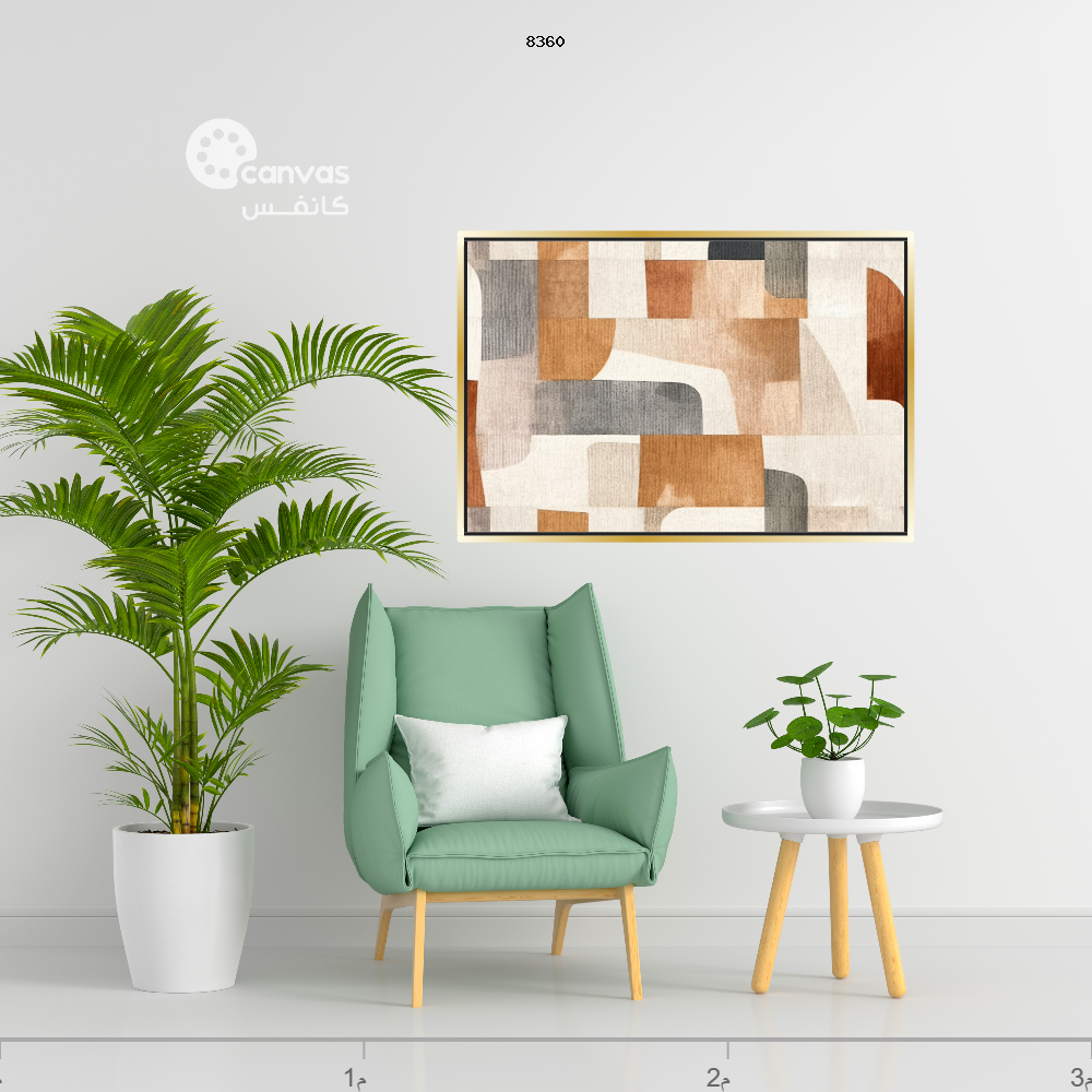 نوع اللوحة: لوحة تجريدية مؤطرة، تتميز بأشكال هندسية بدرجات هادئة من البيج والبني الفاتح والرمادي الباهت، مع لمسات من البرتقالي الباهت.