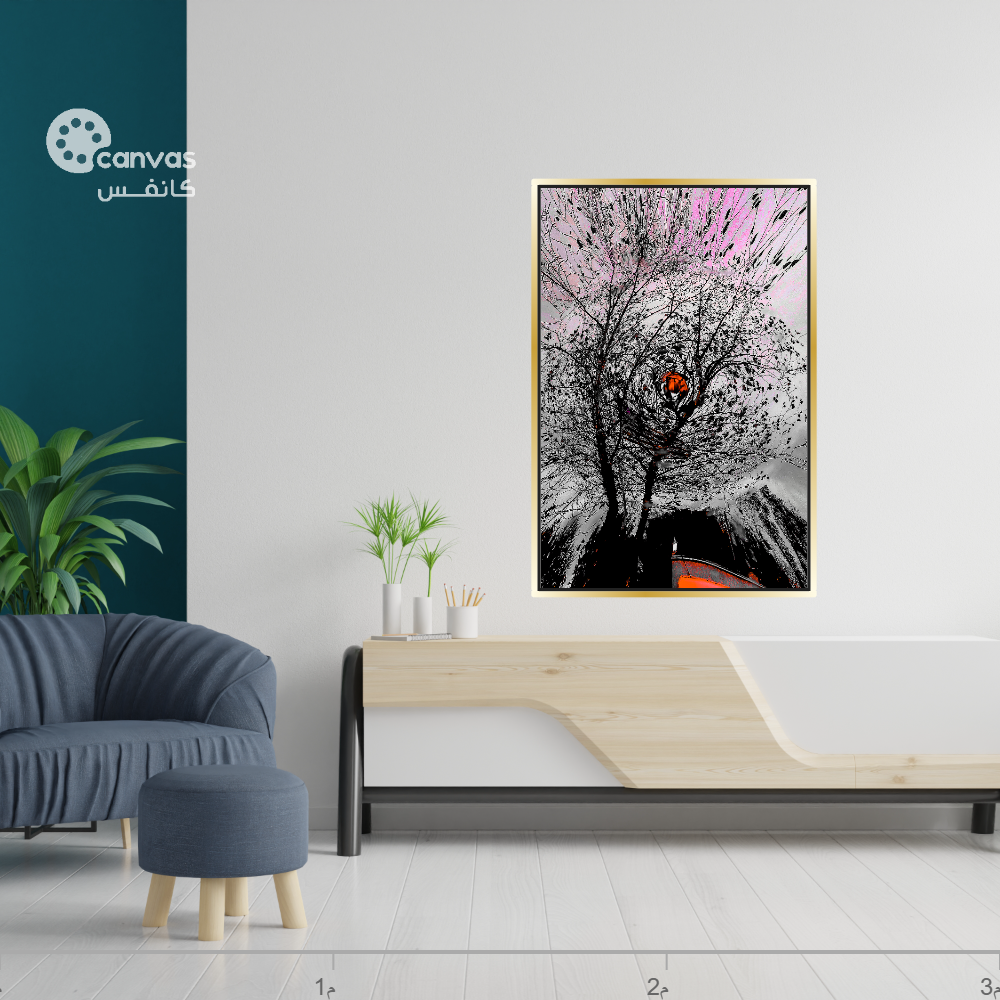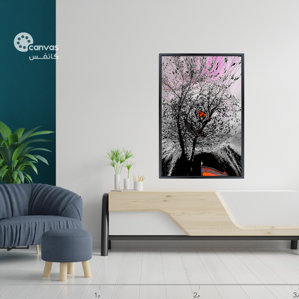 نوع اللوحة: لوحة تجريدية بخطوط سوداء وبيضاء، مع لمسة برتقالية محورية.