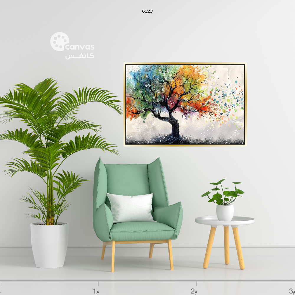 نوع اللوحة: لوحة تجريدية نابضة بالحياة لشجرة. تقع الشجرة في وسط الصورة داخل لوحة قماشية بإطار ذهبي. صُوّرت أغصان الشجرة وأوراقها بألوان متنوعة، منها الأزرق والأخضر والبرتقالي والأصفر والأحمر، مما يوحي بفصول أو حالات مزاجية مختلفة.