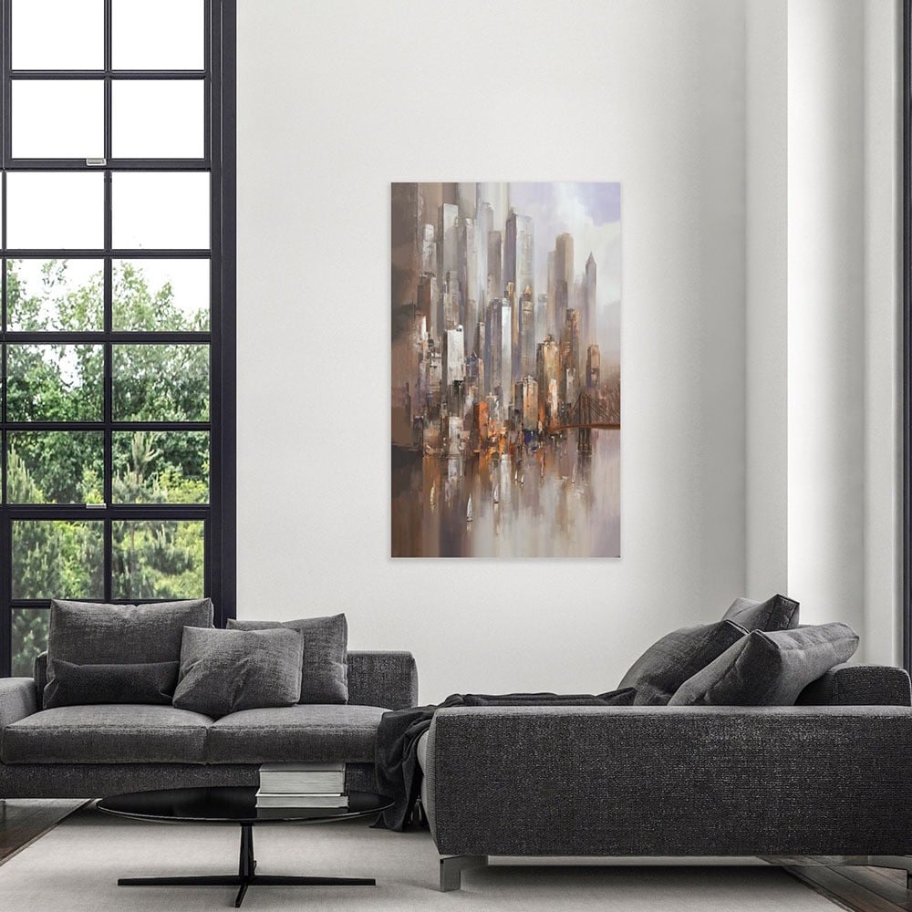 نوع اللوحة: لوحة تجريدية كبيرة لأفق المدينة معلقة على جدار. تتميز اللوحة بدرجات هادئة من الرمادي والبني والبيج، مع لمحات من البرتقالي.