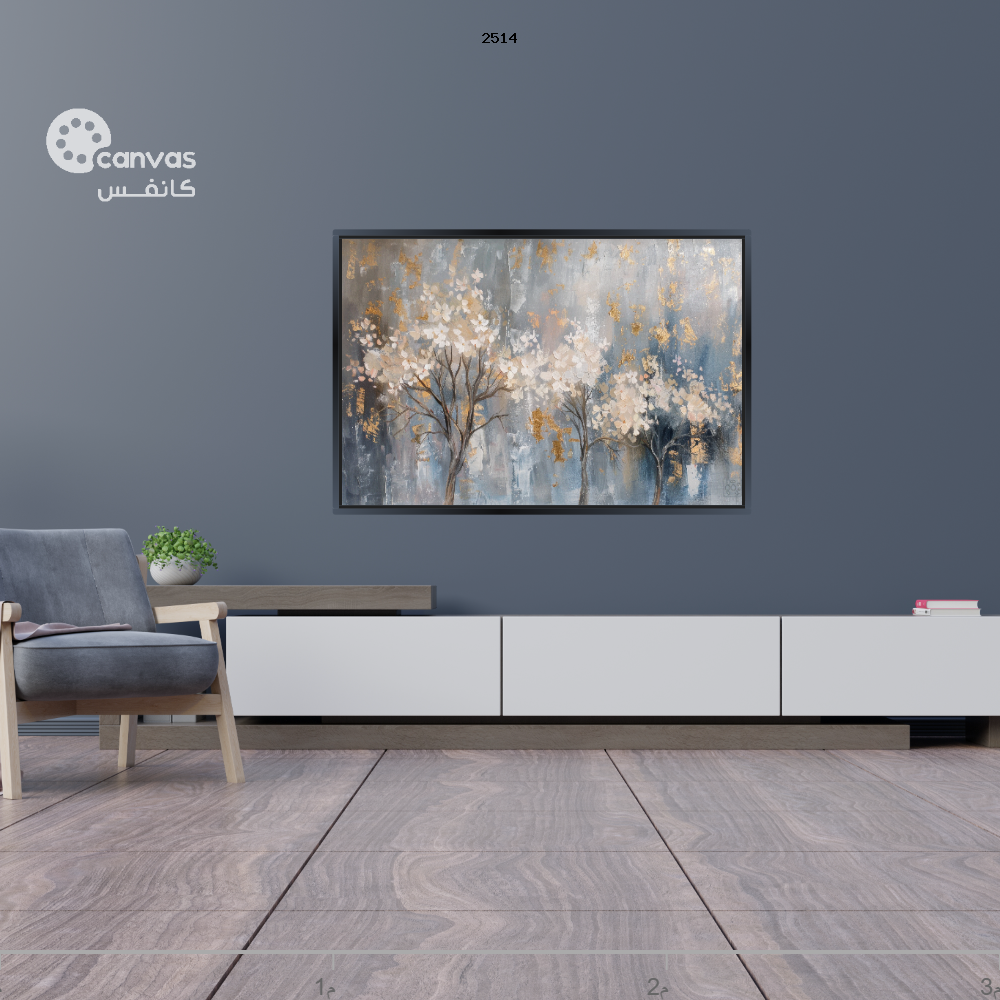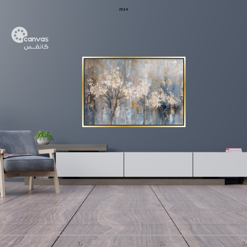 نوع اللوحة: لوحة تجريدية لمنظر طبيعي بأشجار رمادية وبيضاء، مع لمسات ذهبية. الخلفية رمادية ناعمة، والإطار ذهبي.
