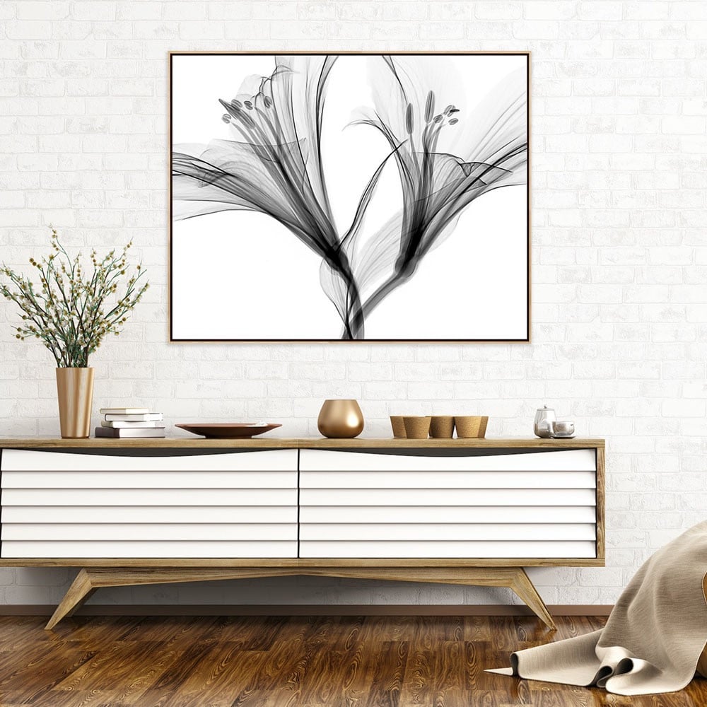 نوع اللوحة: قطعة فنية تجريدية مؤطرة لزهرتي زنبق منمقتين بتدرجات الرمادي. صُوّرت الأزهار بتأثير شفاف، دخاني، أو شبيه بالأشعة السينية، مع خطوط متدفقة وخفيفة تُشكّل شكل بتلات الزنبق وسيقانه على خلفية بيضاء سادة.