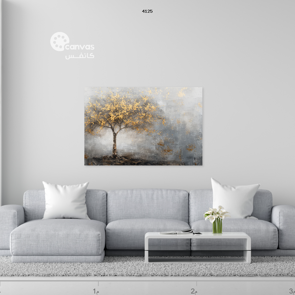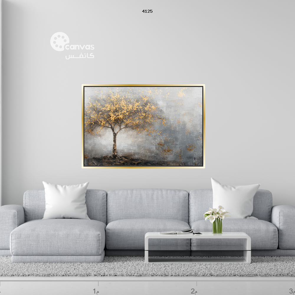 نوع اللوحة: لوحة فنية كبيرة مؤطرة تُصوّر شجرةً واحدةً في مشهدٍ ضبابيٍّ رماديّ. أغصان الشجرة وأوراقها مزيجٌ من ألوانٍ ذهبيةٍ وبنيةٍ باهتة.
