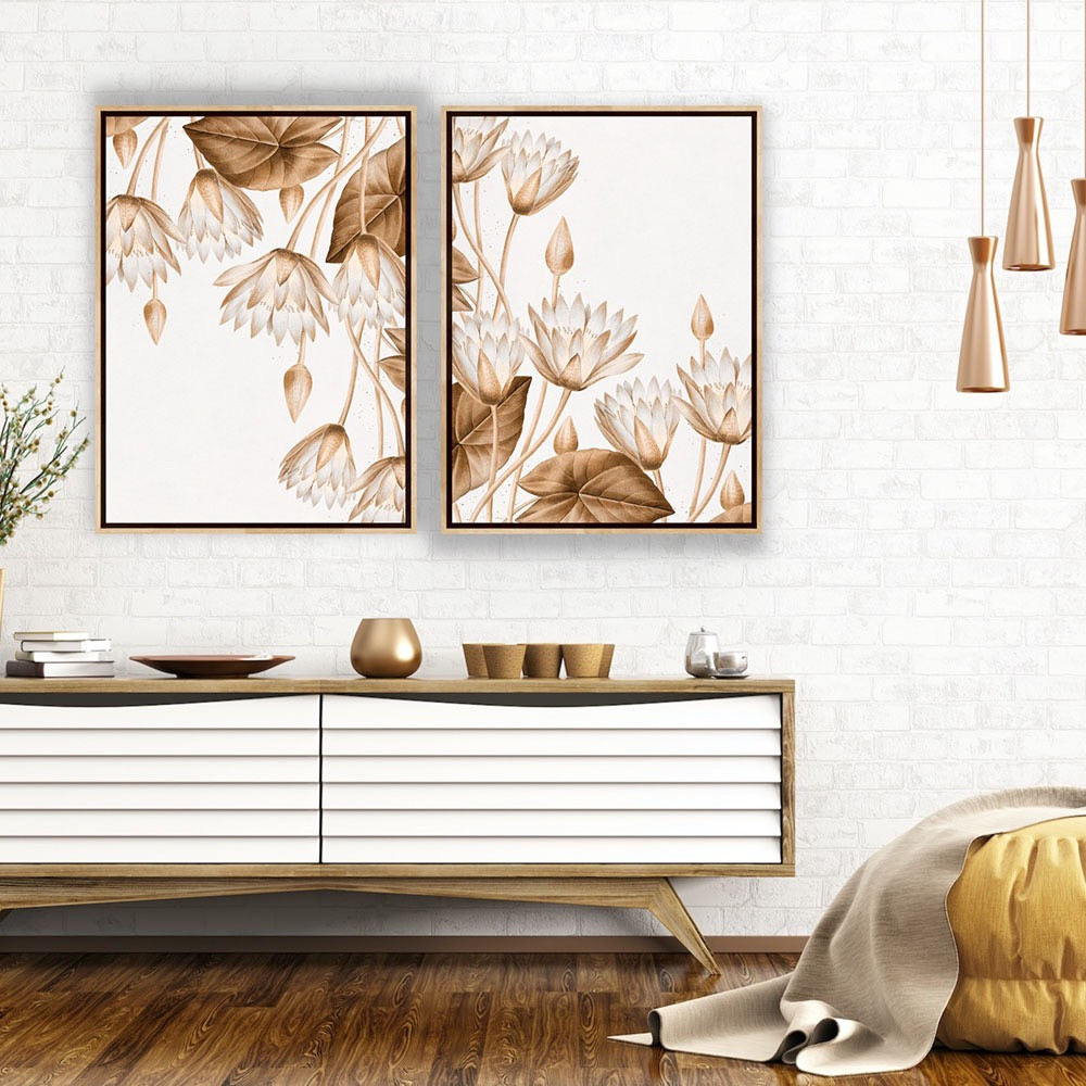 نوع اللوحة: طبعتان نباتيتان مؤطرتان، متجاورتان، تُظهران زنابق الماء بلوني البيج الفاتح والكريمي. زُيّنت الأزهار بتفاصيل برونزية بنية باهتة في أوراقها وسيقانها، مما يضفي عليها لمسة جمالية ناعمة مستوحاة من الألوان المائية.
