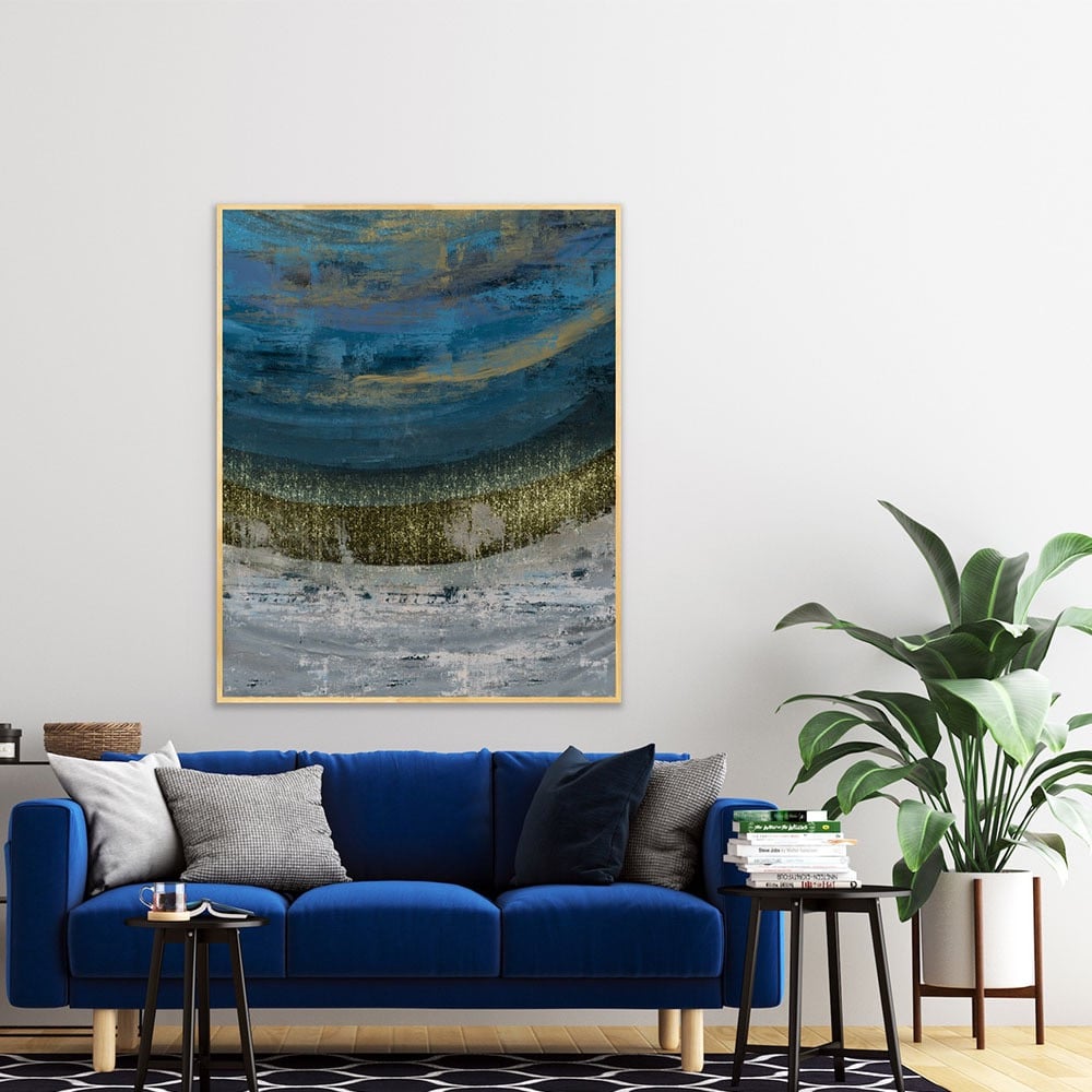 نوع اللوحة: لوحة تجريدية كبيرة، موضوعة في وسط جدار أبيض. تتميز اللوحة بضربات فرشاة متعددة الطبقات ومزخرفة من الأزرق الغامق، والرمادي الباهت، ولمحات من الذهبي، مما يخلق إحساسًا بالعمق والحركة. تنتقل الألوان بسلاسة، مما يوحي بطبقات أو مستويات مختلفة.