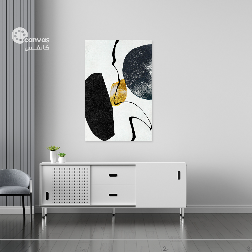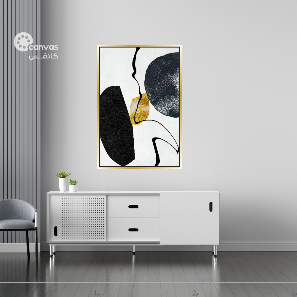 نوع اللوحة: لوحة تجريدية بيضاء بضربات فرشاة سوداء ورمادية وذهبية. الأشكال عضوية ومتدفقة، مع إطار ذهبي وأسلوب معاصر.