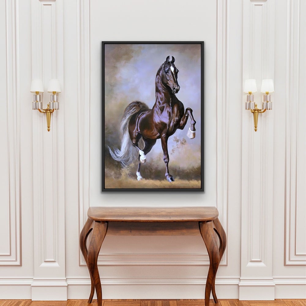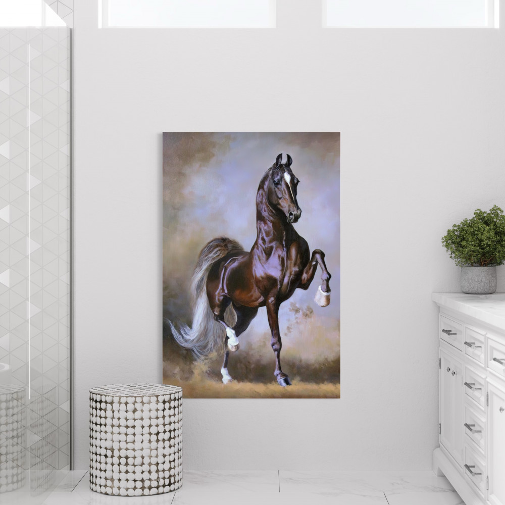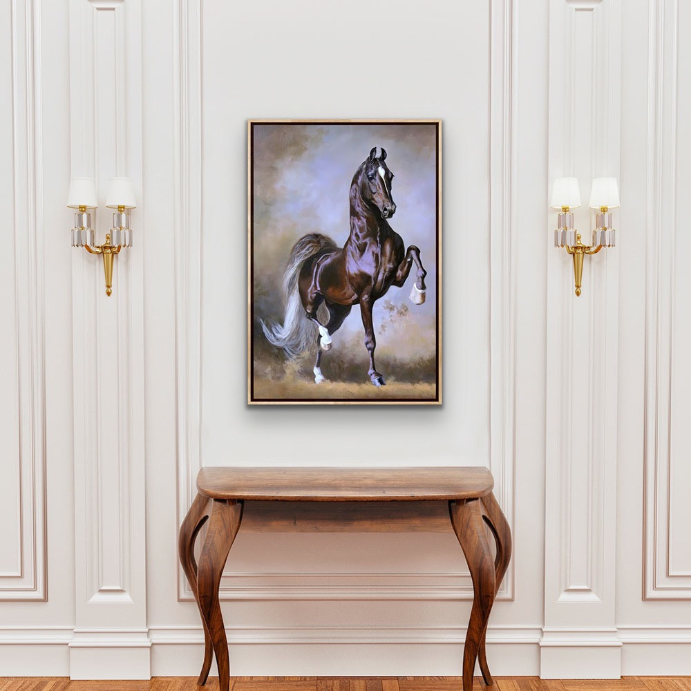 نوع اللوحة: لوحة لحصان عربي بني داكن، موضوعة في وسط لوحة قماشية مؤطرة. يتخذ الحصان وضعية ديناميكية، إحدى ساقيه مرفوعة عالياً، توحي بالحركة. عرفه وذيله أبيضان بشكل لافت، يتناقضان بشكل جميل مع فراءه الداكن. يبدو الحصان بالغاً ناضجاً، ببنية عضلية.