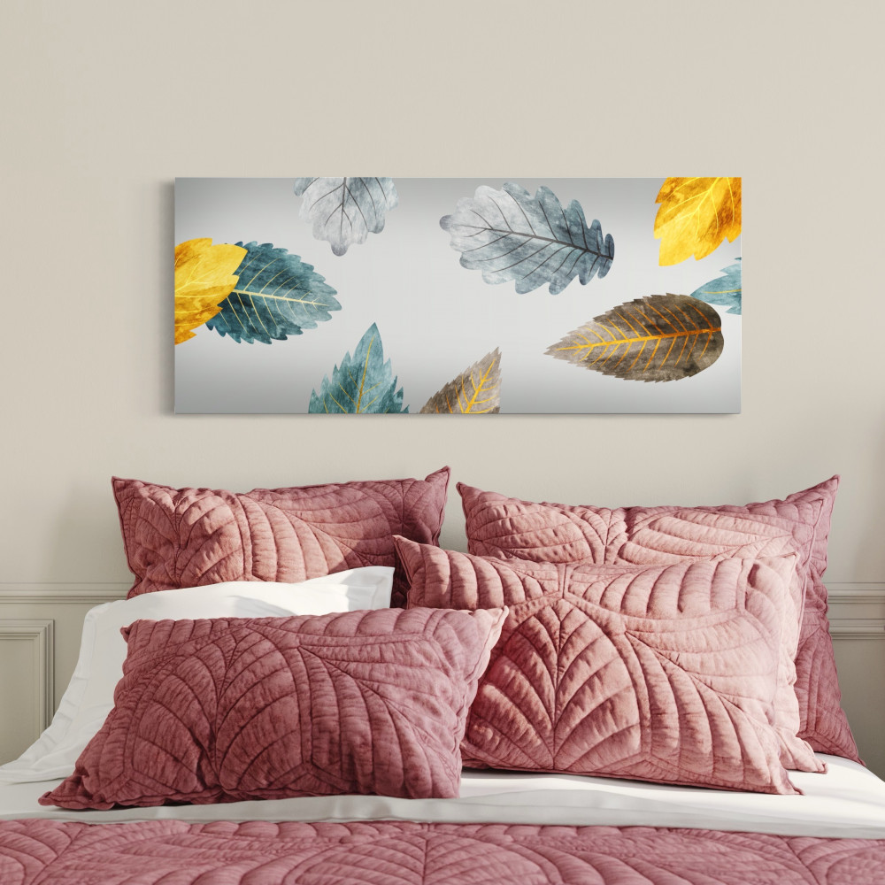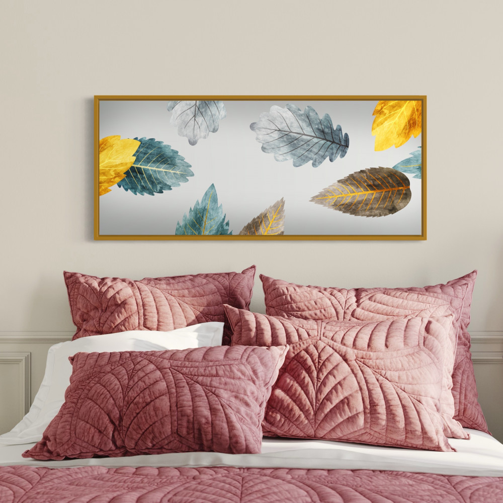 نوع اللوحة: طبعة أفقية لأوراق متناثرة بدرجات رمادي، أزرق مخضر، ذهبي، وبني. أسلوب ألوان مائية بانسيابية.