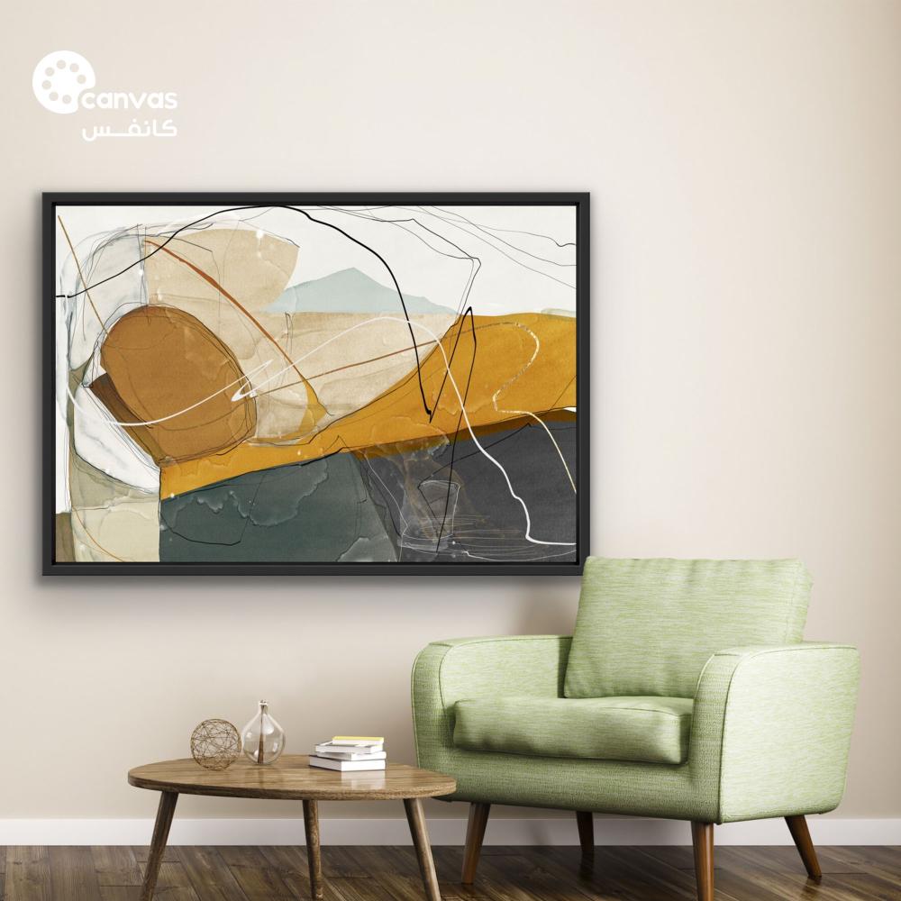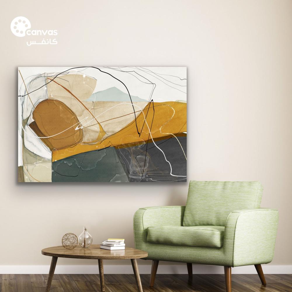 نوع اللوحة: لوحة تجريدية كبيرة، تتميز بتركيبة من الأشكال والخطوط المتداخلة بدرجات من الأصفر الباهت، والأصفر الخردلي، والبيج الفاتح، ودرجات مُختلفة من الرمادي والأخضر الباهت.