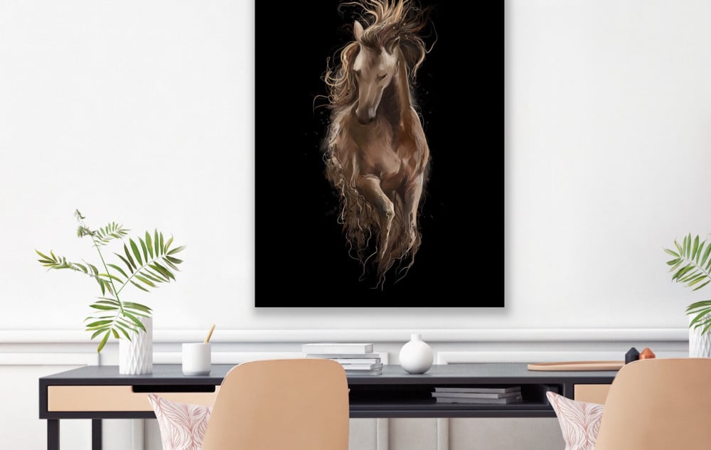 نوع اللوحة: صورة فوتوغرافية كبيرة مؤطرة لحصان بني فاتح. يظهر الحصان في وضعية ديناميكية، يقفز إلى أعلى في الهواء، على خلفية سوداء بالكامل. يتدفق عرفه وذيله بشكل درامي، مما يخلق إحساسًا بالحركة والطاقة.