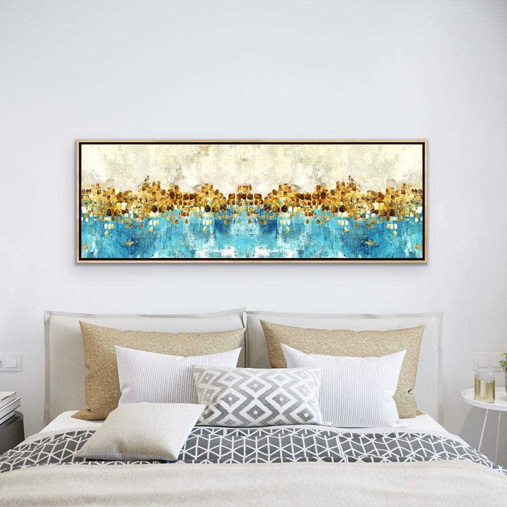 نوع اللوحة: لوحة تجريدية أفقية بشريط من ألوان فيروزي، ذهبي، وبيج/كريمي. تأثير ماء مع انعكاسات ذهبية.