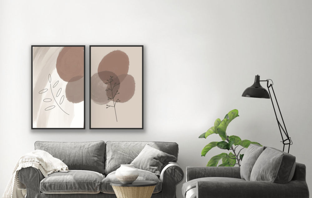 نوع اللوحة: طبعتان تجريديتان مؤطرتان على جدار بيج فاتح. تتميز الطبعتان برسومات فنية خطية بسيطة وأنيقة لأوراق وأغصان، متراكبة على درجات ناعمة وهادئة من الوردي المحمر والبيج.