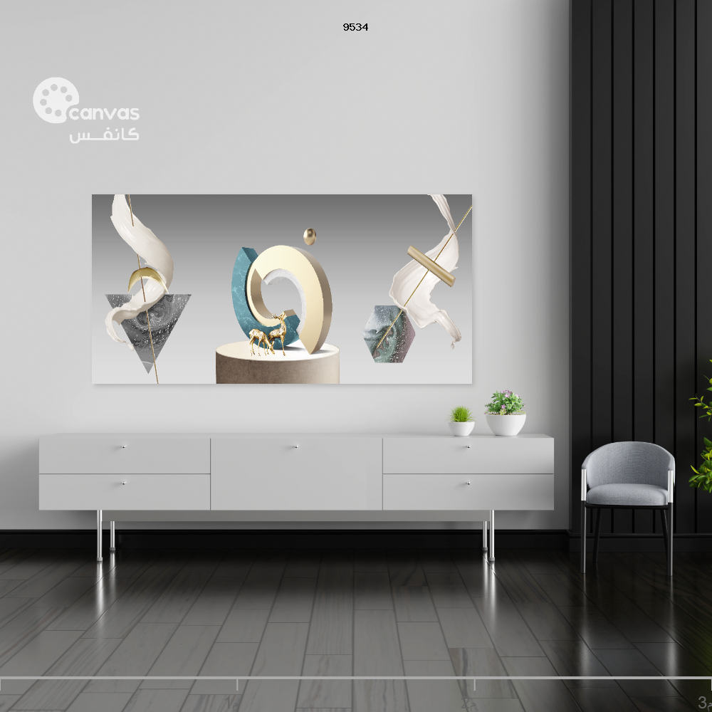 نوع اللوحة: قطعة فنية تجريدية بأشكال هندسية (حلزونات، دوائر) بدرجات رمادي، بيج، وأزرق باهت. لمسات ذهبية وشخصيات حيوانية صغيرة.