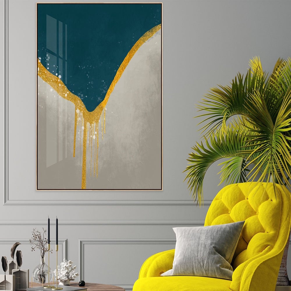نوع اللوحة: لوحة تجريدية مؤطرة تتميز بلوحة ألوان زرقاء ورمادية متدفقة بأشكال متدفقة غير منتظمة. خطوط ذهبية لامعة تنساب في وسط العمل الفني، مما يُضفي عليها مظهرًا ديناميكيًا وغنيًا.
