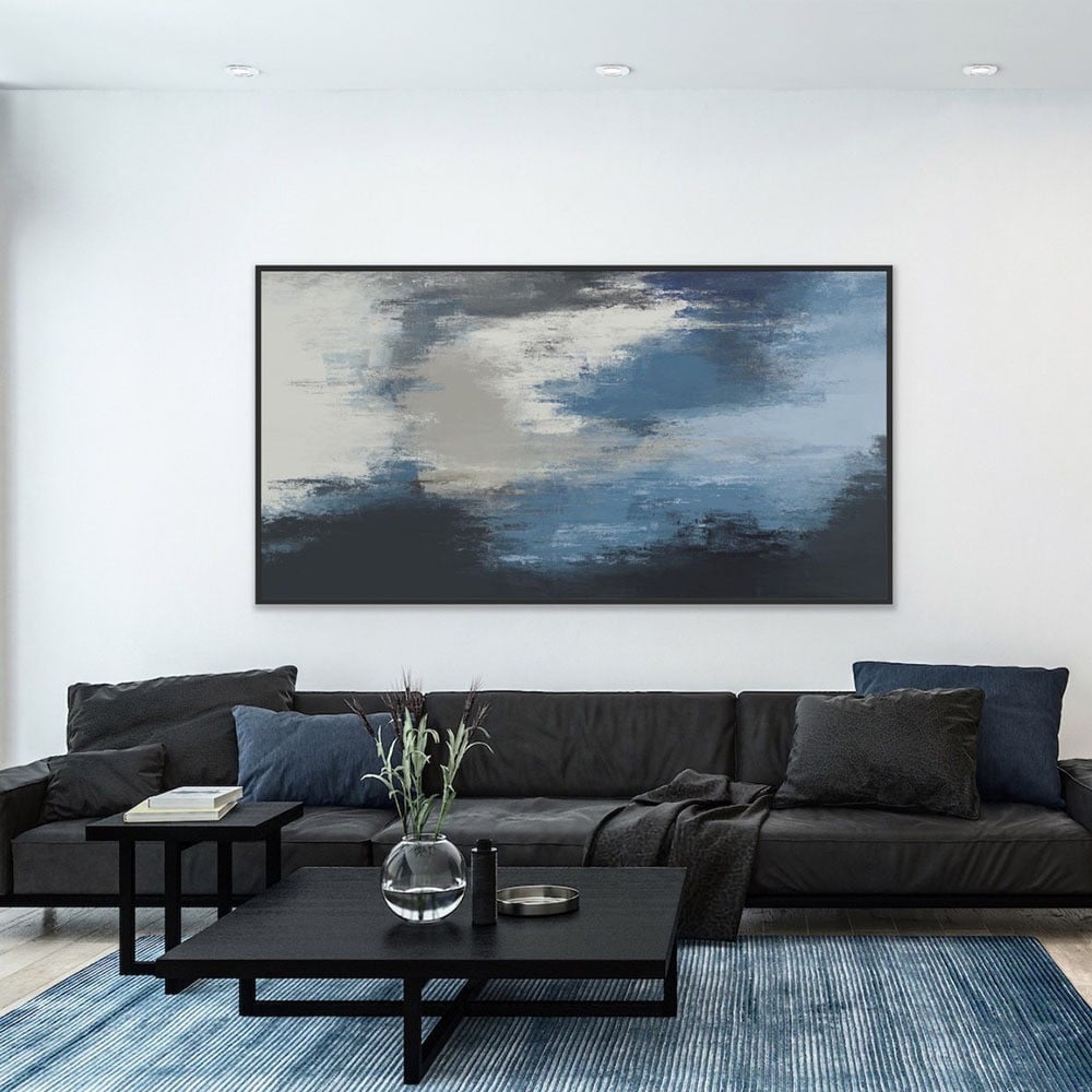 نوع اللوحة: لوحة تجريدية كبيرة، بدرجات من الرمادي الهادئ والأزرق الفاتح والأزرق الداكن، معلقة في وسط جدار أبيض. تتميز اللوحة بضربات فرشاة وألوان مختلطة، مما يُضفي شعورًا بالحركة والعمق.