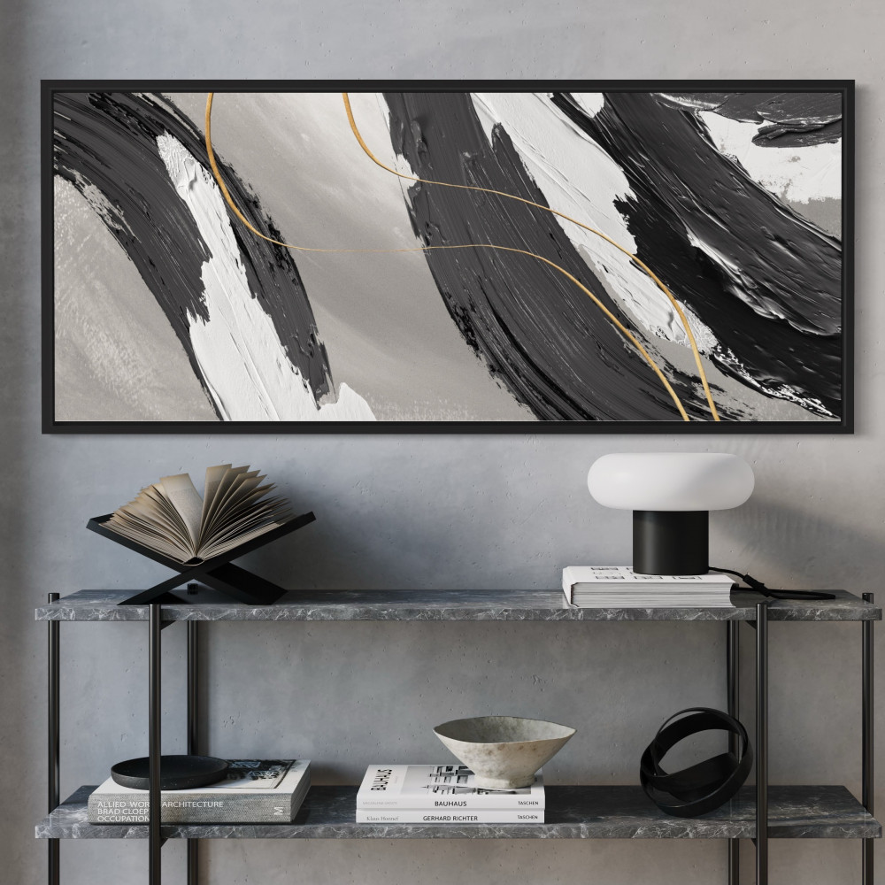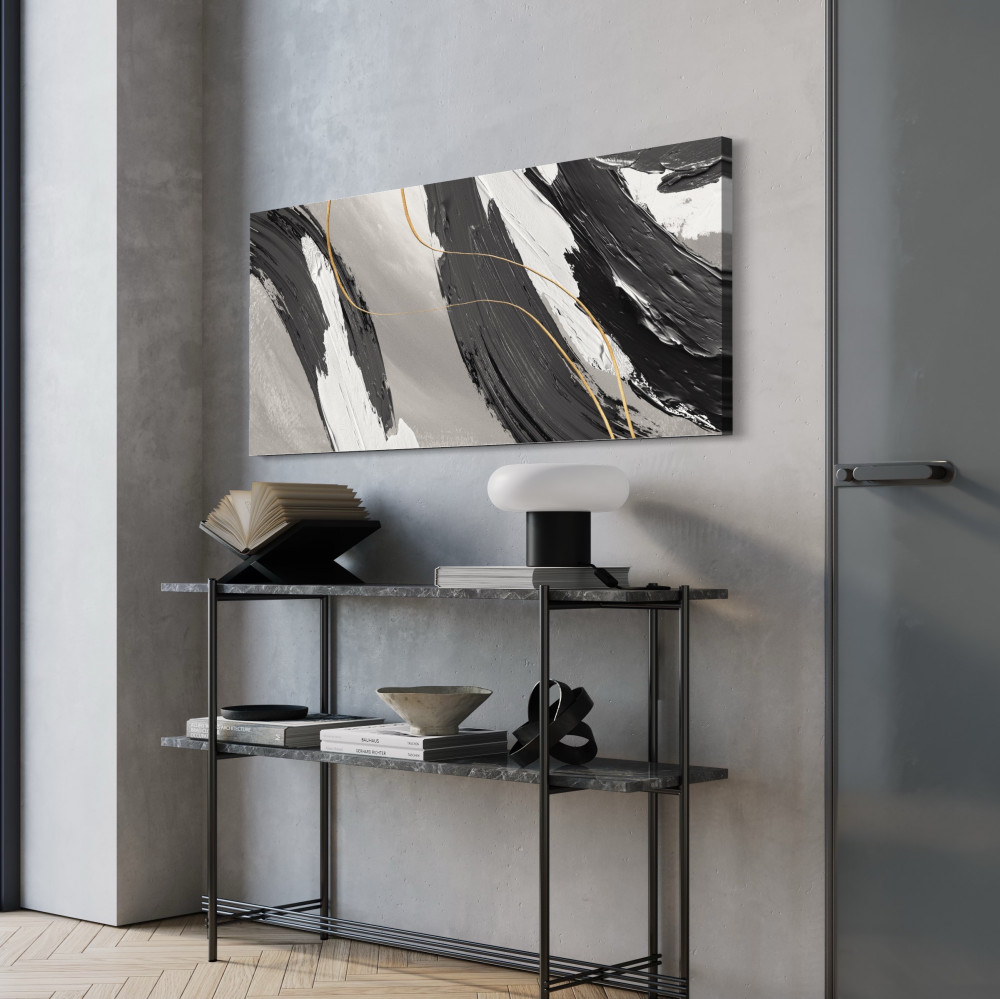 نوع اللوحة: لوحة تجريدية أفقية، موضوعة على جدار. تتميز هذه اللوحة بضربات فرشاة درامية من الأسود والأبيض والرمادي. لوحة الألوان هادئة مع لمسات من الذهبي/البرونزي، مما يضفي عليها طابعًا عصريًا وراقيًا.