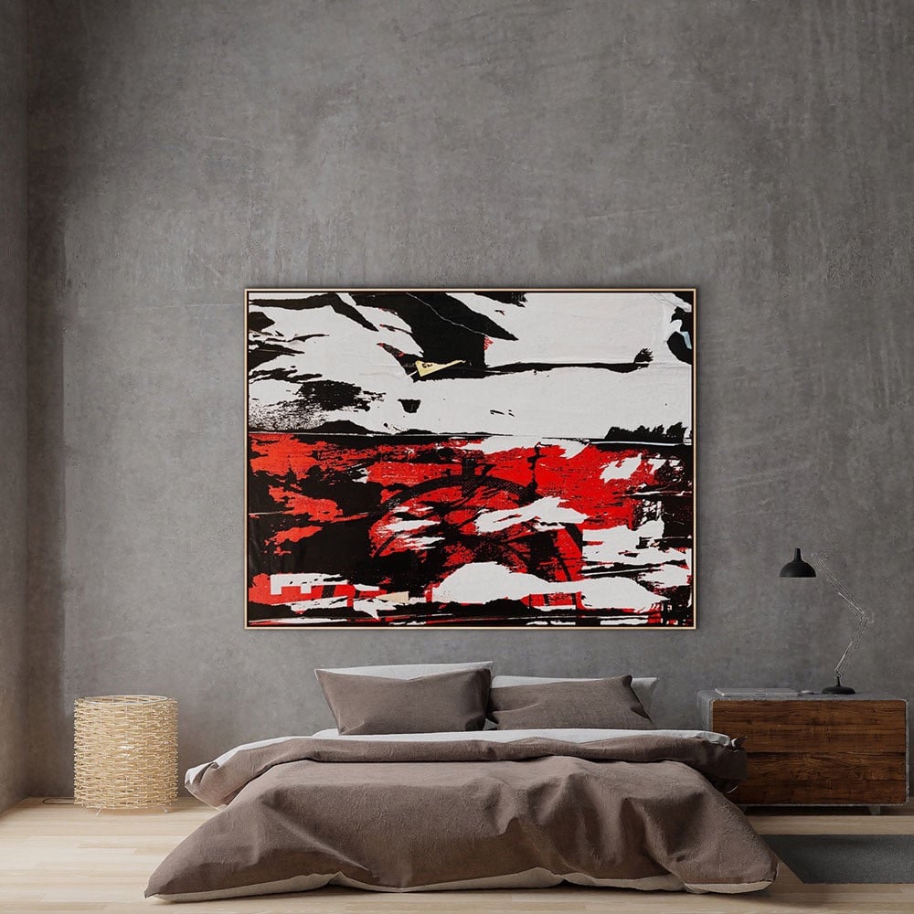 نوع اللوحة: لوحة تجريدية كبيرة مُعلقة على جدار رمادي ذي ملمس خشن. غلب على اللوحة الأسود والأبيض والأحمر، مع ضربات فرشاة كبيرة ومعبرة وعلامات متعددة الطبقات. الألوان جريئة ومتباينة، مما يُضفي تأثيرًا بصريًا ديناميكيًا.